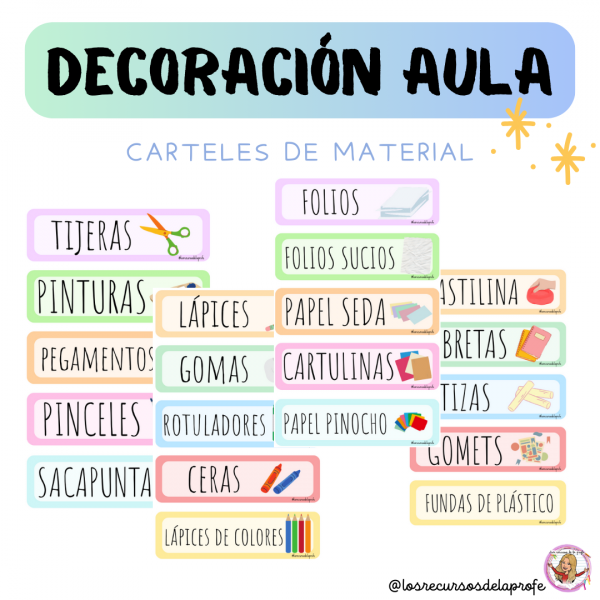 Este recurso incluye carteles con ilustraciones y nombres de diferentes materiales del aula: lápices, gomas, rotuladores, tijeras, pinturas, plastilina, libretas, cartulinas, folios… entre otros.