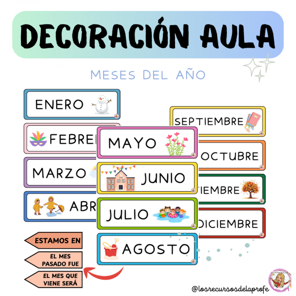 Con este recurso podrás trabajar los 12 meses del año de forma visual y divertida. Incluye carteles grandes, coloridos y fáciles de identificar, junto con tarjetas para señalar el mes actual, el pasado y el próximo.