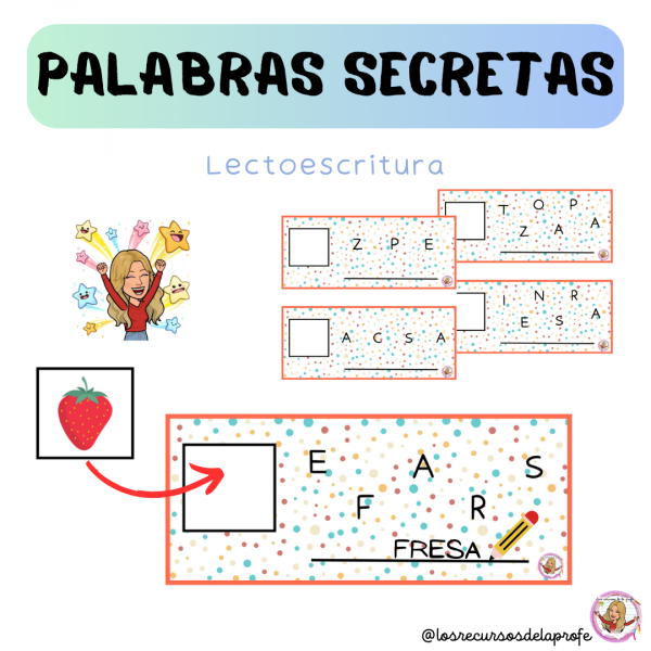 Este material está formado por tarjetas con letras sueltas. Los niños deben descubrir qué palabra forman y luego relacionarla con su imagen correspondiente.