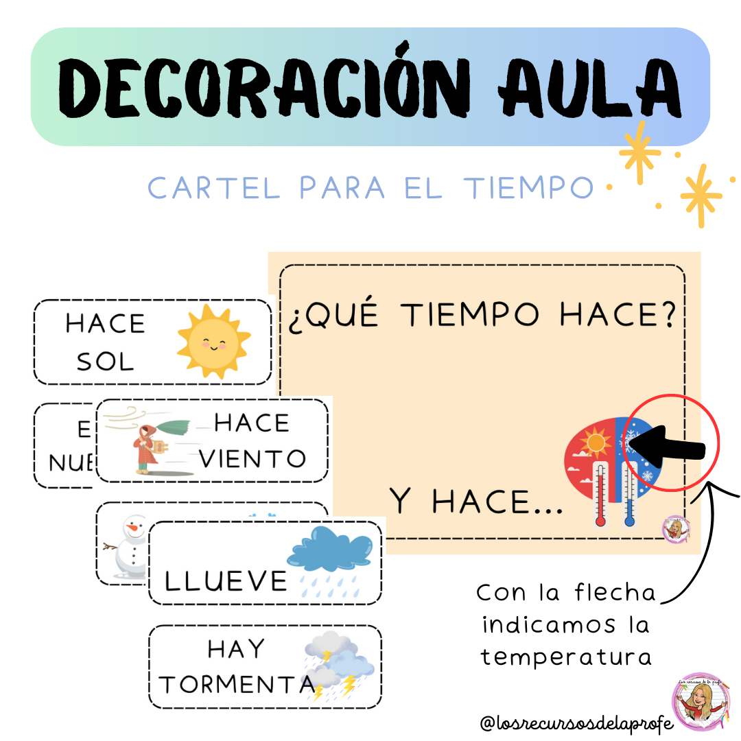 Cartel del tiempo con tarjetas y flecha de temperatura: un recurso perfecto para hablar cada día del clima en clase.